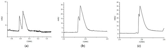 Chiral separation of VIL in the presence of (a) 20 mM α-CD, (b) 10 mM β-CD, (c) 20 mM DIMEB. Analytical conditions: (a)—50 mM acetate buffer (pH—4.5), (b,c)—5 mM phosphate buffer (pH—7.0) voltage: 20 kV, temperature: 20 °C, injection: 50 mbar/3 s.