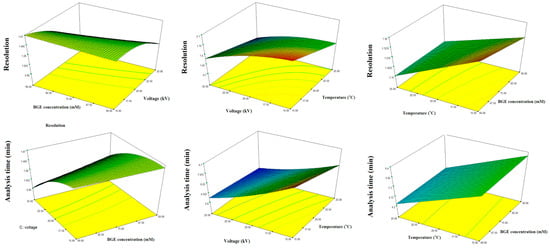As observed, both models contain quadratic and interaction terms, demonstrating the complexity of the effects of the studied experimental parameters on the responses. Based on the F values calculated for each model term during ANOVA, the capillary temperature (factor B) and the applied voltage (factor C) have relatively high and almost equal influences on the Rs-value. In the case of t, the applied voltage has the most prominent effect. The concentration of BGE (factor A) has the weakest influence on both responses, as expected. The three-dimensional response surface plots depicted in Figure 3 represent the interactions between two analytical parameters and their influence on the responses, while the third parameter is kept constant.