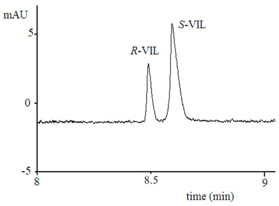 The optimal parameter setting was established by using the optimization feature of the experimental design software. Maximizing Rs values and minimizing t were set as the objectives. The lower limits were set as 1.5 for Rs and 10 min for t, respectively. The factors were optimized with the same weight of priority. The optimal separation conditions were as follows: 75 mM acetate BGE, pH 4.5, 50 mM α-CD, 18 kV, 15 °C. Under the optimal analytical conditions, a baseline enantioresolution (Rs = 2.07) was achieved within 9 min. The generated current under these conditions was around 60 µA. A representative electropherogram of the separation of VIL enantiomers under optimized conditions is presented in Figure 4.