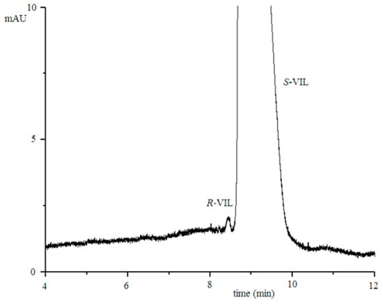 Determination of R-VIL in S-VIL sample. Sample containing 0.1% chiral impurity (experimental conditions the same as in Figure 4).