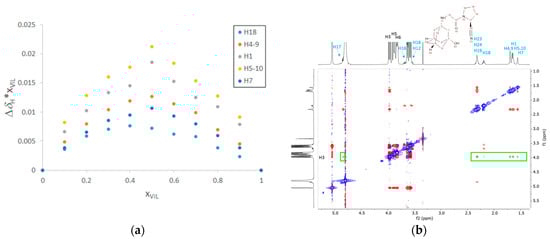 The complexes’ stoichiometry was quantified using the continuous variation method. Different cVIL/cCD ratios were used to measure the 1H NMR chemical shifts. However, the total of cVIL + cCD remained constant at 30 mM. The chemical shift changes in certain hydrogens of VIL induced by the complexation and weighed by the molar fraction of VIL (Δδ × xVIL) were plotted (Job’s plot) as a function of the molar fraction of VIL (xVIL). The registered Job’s plot presented a maximum at 0.5 molar fraction plot indicating a 1:1 ratio of the host and guest in the complex (Figure 6a). The molecular geometry of the complex was investigated by two-dimensional phase-sensitive rotating frame nuclear Overhauser effect spectroscopy (2D ROESY) using 300 ms mixing time. In ROESY experiments, the samples contained 30 mM α-CD and 10 mM VIL. The 2D ROESY NMR spectrum of VIL and α-CD at 1:3 molar ratio showed the proximity of the H3 hydrogen of the host and several hydrogens of the guest molecules (Figure 6b), indicating that both the adamantane and pyrrolidine moieties of VIL may be involved in complex formation. Based on the 1D 1H and 13C (Supplementary Figures S1 and S2) spectra, we can assume that α-CD forms a complex with higher stability with the adamantane moiety. However, in the context of chiral recognition, the less stable inclusion with the pyrrolidine moiety may also play a role, given its proximity to the chiral center. In the 1H NMR spectrum, chiral recognition is not observable because of the high degree of overlap of the multiple signals (Supplementary Figure S1). However, in the 13C spectrum, S- and R-VIL signals are separated, indicating that the basis of the separation lies in the stability difference between the complexes of enantiomers with α-CD (Supplementary Figure S1).
