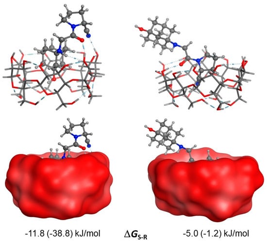 The formation of VIL/α-CD inclusion complexes was verified by both molecular docking and quantum chemical calculations. The two possible types of inclusion complexes involving the adamantane- and the pyrrolidine moieties of VIL, respectively, are presented in Figure 7. Complex formation is thermodynamically favored for both S- and R-enantiomers. Furthermore, the preference towards the inclusion of the adamantane moiety of VIL into the cavity of the CD is also shown. In the case of the adamantane inclusion, by the protonation of VIL, the preference towards the S-VIL/α-CD complex further enhanced from −11.8 kJ/mol to −38.8 kJ/mol. These findings are in accordance with the experimentally observed migration order. To the best of our knowledge, the characterization of the VIL—α-CD complexes at the molecular level is reported for the first time.