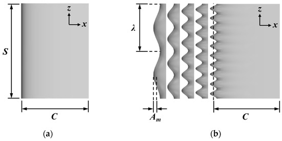 Geometries of (a) smooth and (b) wavy wing with different parameters in the top view.