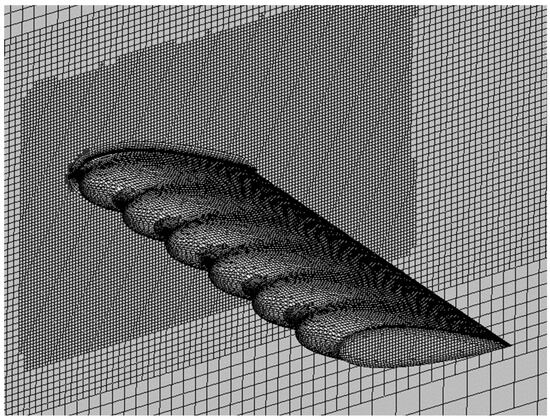 The typical grid distribution close to the wavy wing is displayed in Figure 3. The minimum grid spacing on the smooth and wavy wing surfaces is about 2 10−5, which corresponds to a wall unit of = 1. The grid spacing becomes gradually coarser as the distance separates from the wing surface. The total number of grids is about 2.6 million.