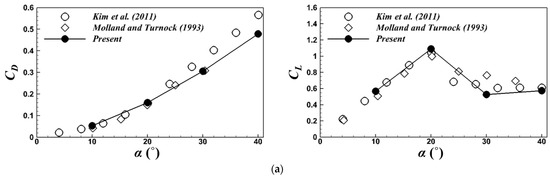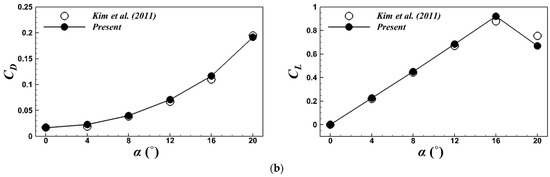 In the smooth wing, the present force coefficients are compared with the experimental data from Molland and Turnock [37] up to the post stall. Figure 4a illustrates that the present force coefficients align well with the experimental results from Molland and Turnock [37]. Furthermore, in the wavy wing with an = 1.5, = 0.0250, and = /4, the present force coefficients are compared with the numerical results of Kim et al. [5]. Figure 4b demonstrates that the force coefficient from the present study closely matches the findings of Kim et al. [5], as shown in Figure 4b.