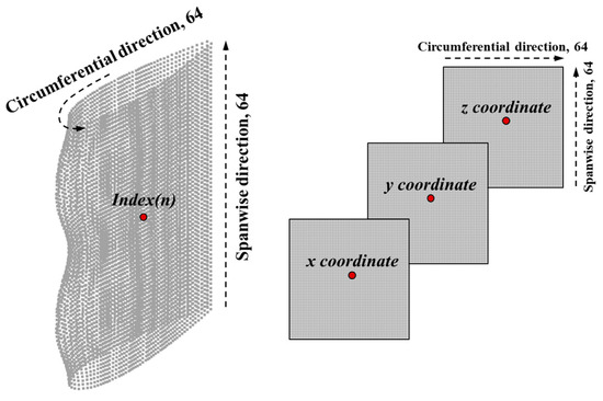 The input data consist of three coordinates: , , and . These coordinates were defined based on the circumferential and spanwise directions on the surface of wing, as illustrated in Figure 5. The number of the spanwise coordinates is 64, and also the same number of coordinates, 64, is allocated along the circumferential direction. Therefore, for each individual wing, the total number of coordinates is 4096 3, as depicted in Figure 5.