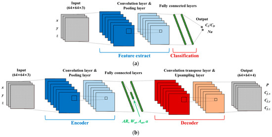 The architectures of the CNN and ED models were tested by changing various hyperparameters of the convolution layer, the transpose convolution layer, and the fully connected layer. These architectures were evaluated by the MSE convergence histories, achieving proper hyperparameters. The predicted aerodynamic coefficients and Nusselt number for smooth and wavy wings using the CNN were compared to the true using a scatter plot; it showed a very similar result.