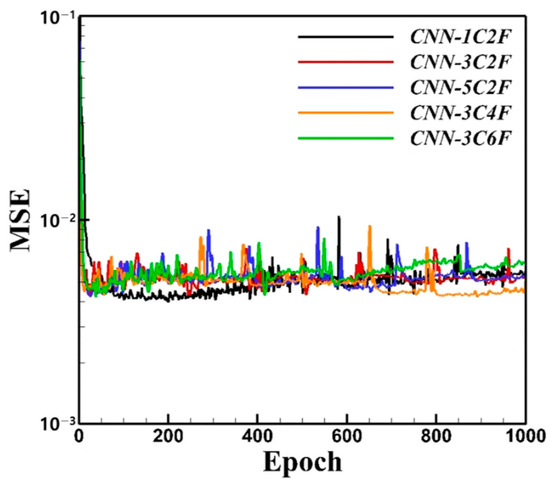 First, the dependence of the training of the CNN model on the number of the convolution layers is evaluated for the fixed fully connected layer numbers of 2. The constructed architectures of CNN models are named as CNN-1C2F, CNN-3C2F, and CNN-5C2F, as shown in Table 1, which are considered to investigate the effect of the convolutional layer number on the convergence of the error.