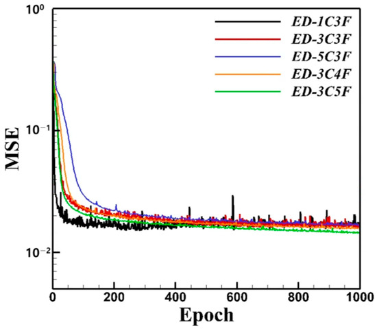 In the same procedure as the CNN model, the error convergence of the ED model is also evaluated. Figure 8 presents the convergence histories of the MSE for five different ED architectures. As a result, the convolution and transposed convolution layers of ED-1C3F, ED-3C3F, and ED-5C3F are tested to discover their effects on the convergence of the MSE. There is a negligible difference between different layers in the MSE convergence histories, as clearly identified in Figure 8. Therefore, ED-3C3F with the medium layer number in the three ED architectures is adopted to evaluate the number of fully connected layers by using 3, 4, 5. As a result, three fully connected layers of ED-3C3F, ED-3C4F, and ED-3C5F result in minor differences in MSE convergence. Also, the evaluated ED architectures give almost the same saturation of the MSE. Finally, ED-3C5F is chosen to predict the flow and thermal fields.