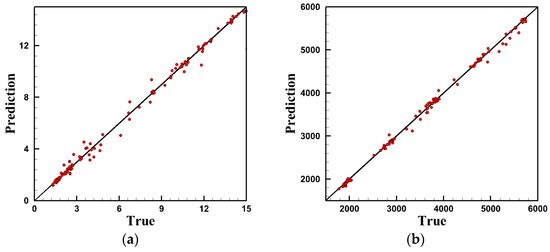 The samples of the 147 wavy wings are used for testing the trained CNN model. Testing the trained CNN model is performed to assess the accuracy of the prediction. and are predicted for the inputs of the , , and coordinates on the surface of the wavy wings. and are commonly used to assess the aerodynamic performance and the thermal efficiency of the wing, respectively. The prediction results achieved by the CNN model are exhibited as scatter plots for and , with true calculated by CFD, as shown in Figure 9. Most of the predicted and are clustered in the vicinity of the 45-degree line, as shown in Figure 9a and 9b, respectively. This clustering indicates that the predicted and from the CNN model developed in present study are similar to the true obtained by CFD.