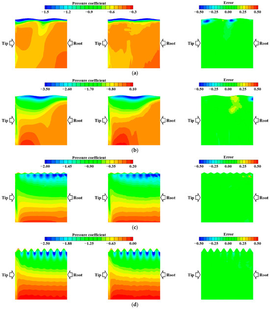 A relatively large difference between the prediction and true is observed near the leading edge and root of the wing, where the local pressure exhibits sharp gradients, as shown in Figure 10a–c. In contrast, the results are remarkably consistent between the prediction and true near the trailing edge, where the pressure gradients are relatively low, and near the wingtip, where the characteristic features of the tip vortex are clearly visible, as shown in Figure 10. As the wave amplitude and wave number increase, the pressure distribution is very well predicted near the crest and trough of the leading edge, where the shape of the wave wing is more prominent. Additionally, the pressure distribution in the vicinity of the tip vortex is consistently predicted in all cases.
