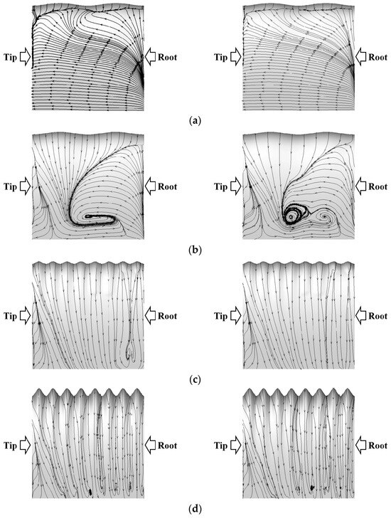 The developed ED model similarly predicts the limiting streamlines on the upper of wavy wing compared to the true, irrespective of the wave parameters, as identified in Figure 11. According to these wave geometric parameters, the characteristics of the limiting streamlines of true were well predicted by the ED model. In Figure 11a, the flow separates from the leading edge. Also, in Figure 11b, the limiting streamlines exhibit a helical nature, leading to convergence lines and return flow from the trailing edge. Figure 11c,d display flow patterns that closely resemble those of a smooth wing, with a small vortex appearing locally near the trailing edge due to the wave effect. These patterns of limiting streamlines correspond to the pressure distribution, as previously shown in Figure 10c,d. Furthermore, these patterns of limiting streamlines are consistent with the results of previous studies [5,42,43]. As a result, regardless of wave parameters, the characteristics of limiting streamlines such as flow separates, helical nature, and small vortex were almost similarly well predicted, as shown in Figure 11.