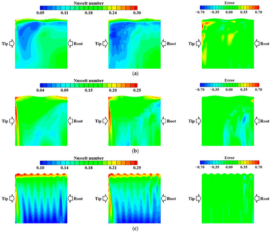 Figure 12 shows the contours of the Nusselt number on the upper surfaces of the wavy wings. Thus, comparisons of the predicted and true thermal fields can be performed. Also, the distributions of errors between the prediction and true are presented, which measures the accuracy of the developed ED model for predicting the thermal field. The forced convection over the smooth and wavy wings is governed by the flow. Therefore, these forced convections can be explained by the flow fields.