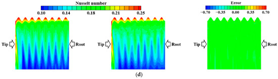 The prediction results in Figure 12 exhibit oscillations at the contour boundary, similar to the prediction of the pressure distribution in Figure 10. However, the prediction is similar to true across the board. Figure 12 shows a similar error distribution to that shown in Figure 10a,c. A relatively large difference is exhibited between the prediction and true near the leading edge and the root of wing, as shown in Figure 12a–c. In particular, the Nusselt number distribution is well predicted near the trailing edge of the wing, mirroring the characteristics of the limiting streamline shown in Figure 11c,d, as shown in Figure 12c,d. The Nusselt distribution on the surface of wing, as shown in Figure 12, exhibits a similar trend to that shown previously in Figure 10 and Figure 11. As a result, higher accuracy is observed in cases where the characteristics of the wave are more pronounced.