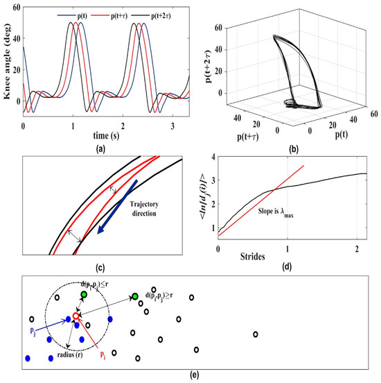 Schematic diagram of estimating MLE. (a) Time-series angular data of knee joint movement by a time delay (). (b) Trajectory of the system formed in the reconstructed state space. (c) Euclidean distance in the reconstructed attractor. (d) MLE values are the slope of the mean log divergence curve. (e) Illustration of estimating Sample Entropy.