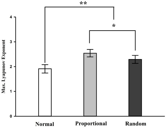 Interestingly, the MLE showed significantly higher exponential values for proportional pattern changes than for random pattern changes. The movement pattern of the lower-extremity joint was found to be the most unstable under proportionally changing speed conditions and this was confirmed by quantitative MLE values. Contrary to the initial hypothesis, there was no significant decrease in the mobility stability under the random change condition. In healthy young adults identified in a previous study, the rapid response to unexpected situations may support our results [34]. Overall, this study strongly suggests that younger, healthier individuals have higher predictive abilities, which may be a result of choosing gait patterns in response to unexpected perturbations.