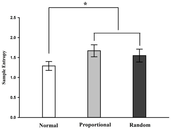 Average Sample Entropy that implements lower limb joint movement for change in speed conditions. ‘*’ denotes a statistically significant effect of the fixed speed condition ‘Normal’ over the other variable speed conditions.