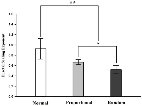 Average Detrended Fluctuation fractal scaling exponent that implements stride length for change in speed conditions. ‘*’ denotes a statistically significant effect of variable speed condition. ‘**’ denotes a statistically significant effect of the fixed speed condition ‘Normal’ over the other variable speed conditions.