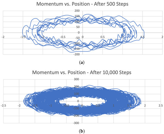 Simulated phase space for a coupled harmonic oscillator after (a) 500 and (b) 10,000 steps.