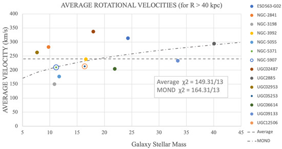 We find that a simple average of the asymptotic velocity outperforms both Newtonian and MOND regressions. Figure 9 shows a plot of velocity across the chosen galaxies in terms of the maximum radius of observation for each galaxy, which we use as a proxy for the present-day radius of the galaxy. Figure 10 shows the velocity with respect to the galaxy stellar mass, along with the average and the MOND fitted curve. We also perform a log regression of the velocity to stellar mass to find that the p-value is zero, just as in the case of Newtonian and MOND regressions. Granted, this is a very simplistic and selective analysis, but it does appear to suggest that the galaxy’s asymptotic velocity, when analyzed across galaxies, is not a function of stellar mass.