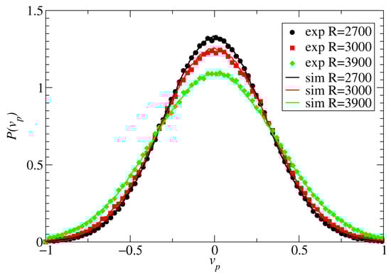 The linear model described by Equation (1) features physical parameters that can be directly controlled in the experiments and others whose values can be fitted to match the measured data. The amplitude of the white noise is related to the acceleration a provided by the shaker and to the sampling rate of the input signal, , where s. The mechanical parameters and M are related to the characteristic frequency of the system, which for the experimental apparatus is Hz. Finally, the capacitor is estimated as nF. The other parameters can be fitted to the experimental data through Equation (12) as a function of R. We performed several experiments with different values of [2700–3900] and measured the average extracted power . From the fit, we obtain the following values: Kg, N/V, Kg/s. The shaker acceleration is m/s2. Using these values of the parameters, we performed numerical simulations of the model in Equation (1) to measure the quantity in the case R = 2700, 3000, 3900 and its distributions. The numerical results are in very good agreement with experimental data (see Figure 3), showing that the linear model very well describes the dynamics of the system. Once assessed the effectiveness of the theoretical model, we next focus on the study of the non-equilibrium properties of the system, as discussed in the following section.