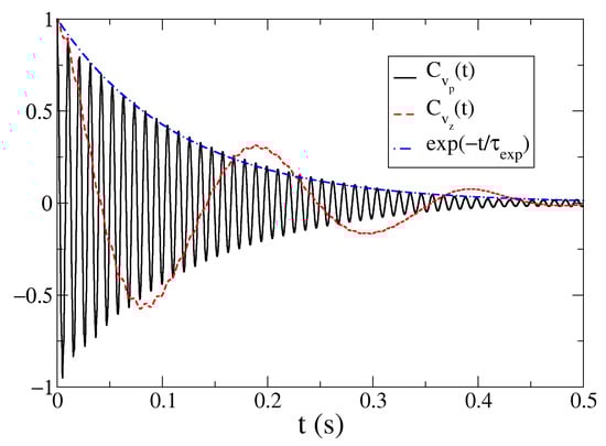 that are characterized by an exponential decay, modulated by an oscillatory behavior. The characteristic decay time is estimated as s, while the oscillation period is s. These values are in good agreement with the theoretical values obtained from the study of the eigenvalues of the matrix of the model, which give s and s. An accurate study of the analytical form of time correlation functions in non-Markovian systems is presented in [27].