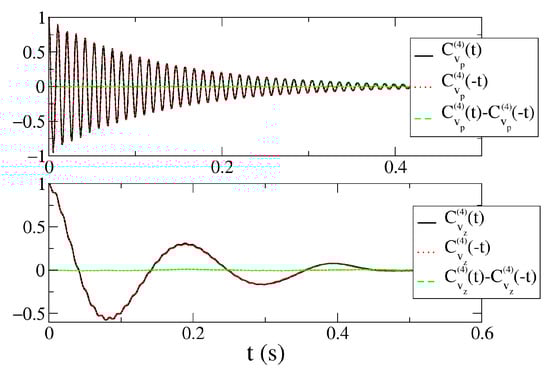 By construction, from these two-point autocorrelation functions, one cannot extract any information on the irreversible dynamics of the system. In order to define correlation functions with a single variable that could unveil a time-asymmetry, one has to consider higher-order correlators. In particular, from the time series of and , we compute the following normalized correlation functions: