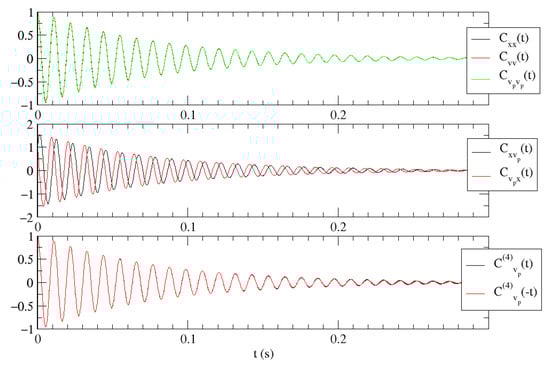 To further support our findings, we performed the same analysis on the numerical simulations of the model Equation (1). In particular, we numerically computed the voltage , the velocity , and the position , which can be directly accessed in the simulations. The results reported in Figure 7 confirm the scenario described above for the experimental data: analyses of (high-order) correlations of a single variable do not allow one to reveal a non-equilibrium behavior (top and bottom panels), whereas cross-correlation functions show the breaking of the time-reversal symmetry (middle panel).