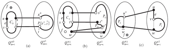 Case 2: , . Without loss of generality, we can select . Definition 2 ensures that can be partitioned into two -dimensional hypercubes, denoted as and . Denote , , and . It follows that and . We have three subcases according to the distributions of the fault-free edge e.