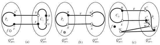 - , i.e., .Since the number of vertices that adjacent to the vertex u in is 2, there must exist such a vertex adjacent to the vertex u such that . For clarity, , . According to the relationship between and , we distinguish the following subcases: