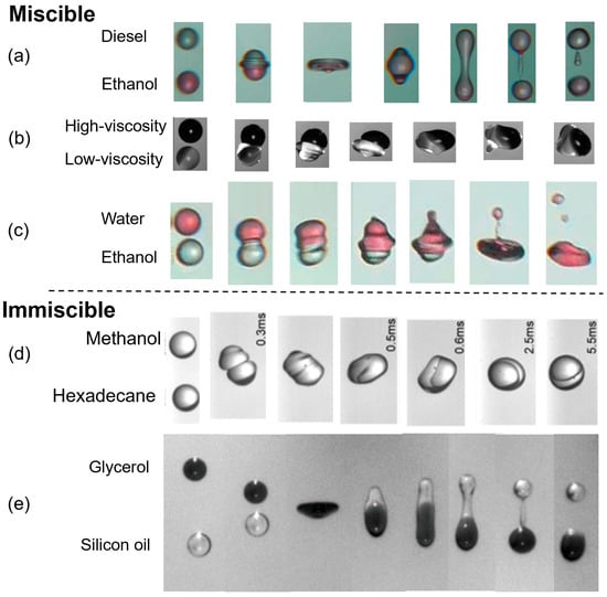 - Chen, R.H.; Chen, C.T. Collision between immiscible drops with large surface tension difference: Diesel oil and water. Exp. Fluids 2006, 41, 453–461. [Google Scholar] [CrossRef]