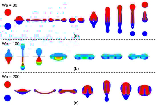 - Al-Dirawi, K.H.; Al-Ghaithi, K.H.; Sykes, T.C.; Castrejón-Pita, J.R.; Bayly, A.E. Inertial stretching separation in binary droplet collisions. J. Fluid Mech. 2021, 927, A9. [Google Scholar] [CrossRef]