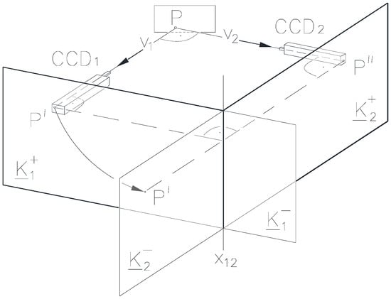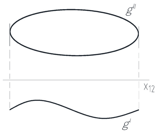 - Assume that from the image curves g′ and g″ of the curve g, g′ is a double projection, and it can be written as a function x = f1(y), and the g″ cannot be written as a function z = f2(y) on the corresponding Cartesian coordinate plane. In this case, a single y corresponds to a point f1(y) ≡ P′ fitting to the plane [xy] ≡ K1 and several points f2(y) ≡ P″ fitting to the plane [yz] ≡ K2. These one P′ and several P″ points located perpendicular to the y ≡ x12 axis can be assigned to each other to form ordered pairs of points, to which several spatial P points belong. Thus, any point of the curve g and thus any part of it can be clearly reconstructed from only two images.