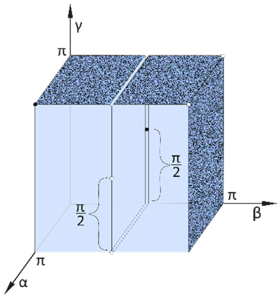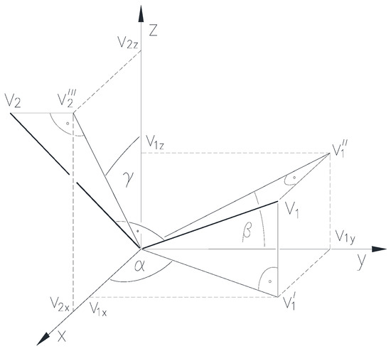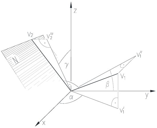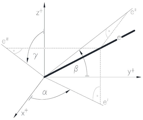 The third directed angle γ (0 ≤ γ ≤ π) of the straight line e passing through the origin point O is the angle by which the semi-axis z+ can be rotated to the third projection e‴ of the straight line e on the plane [zx] in the direction of the semi-axis x+, counter-clockwise viewed from the infinity point of the semi-axis y+ (Figure 6). The third directed angle should be interpreted according to γ = 0, if the straight line e coincides with the axis y. The third directed angle of the straight line e bypassing the origin point O is the same as the third directed angle of the straight line parallel to it passing through the origin point O.