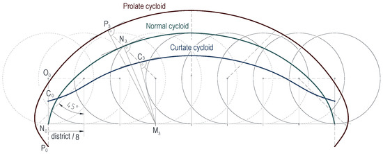 One of Monge’s most talented students was Theodore Olivier, who is primarily known for creating three-dimensional moving models of descriptive geometric processes. Olivier’s moving models led to the study of movement transmission by means of descriptive geometry, which provided the basis for differential geometric analyses [14]. The time stability of steps leading to Olivier’s results can also be excellently observed in the typical case of the generation of 2D curves, according to which the interpretation of the synthetic geometric evolution of the roulettes is the basis of their analytical definition. For the computer 2D graphic representation and 2D animation of roulettes, their analytical formulation based on their synthetic geometric analysis is required, which leads all the way to the topic of related surface pairs and the gearing [15].