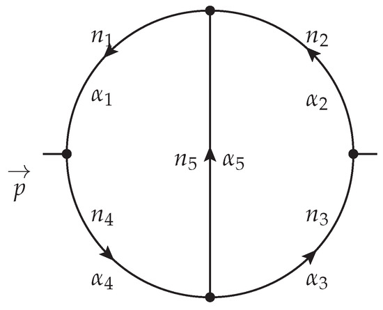 Thus, diagrams that can be represented as combinations of loops and chains can be immediately calculated by applying the Equations (4) and (10) discussed above. However, starting from the two-loop level, diagrams appear that are not expressed as combinations of loops and chains (the simplest example is shown below in Figure 1). For such cases, there are additional rules that are shown below only graphically to increase their visibility.