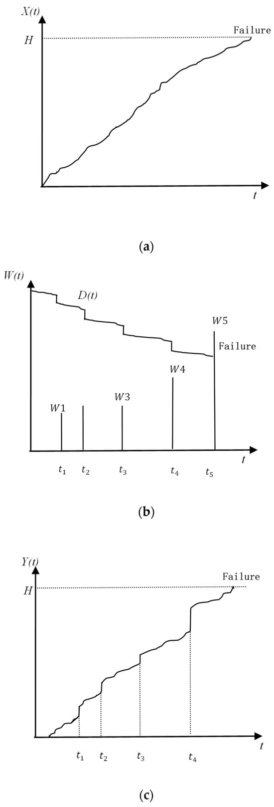 Soft failure occurs when the degradation performance is greater than the critical threshold level, as shown in Figure 1a. External random shocks affect the stresses in a system by bringing a sudden increase in the degradation properties. Thus, the system undergoes both natural degradation processes and random shock processes during the working period, which are not independent, and random shocks have an effect on the natural degradation. The effects of random shocks on a system can be categorized into two types: shocks whose magnitude exceeds the hard failure threshold lead to hard failure of the system, as shown in Figure 1b; shocks where the shock magnitude is always below the hard failure threshold, but each non-lethal shock leads to an increase in the degradation performance of the system, and the system eventually reaches the soft failure threshold under the effect of natural degradation and random shocks, thus failing, as shown in Figure 1c.
