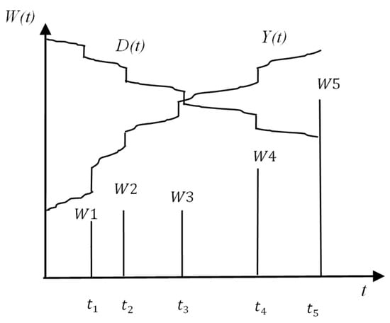 The natural degradation process and the random shock process are defined above, and once the total degradation of and exceeds the soft failure threshold , the system will experience soft failure. Hard failure caused by the random shock process depends on the natural degradation process, and once the intensity of the random shock exceeds the hard failure threshold, the system undergoes hard failure. As the system degrades naturally, the system’s ability to resist shocks decreases as shown in Figure 2.