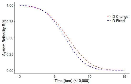 In past studies, most scholars believe that the ability of the system to resist shocks does not change during system degradation, which may lead to overestimation of the reliability of the system. However, in actual engineering applications, the system degrades continuously, and the ability to resist shocks is gradually weakened in line with the engineering reality. The reliability function curves of the system for fixed failure threshold and varying failure threshold cases are given in Figure 3. It can be observed in the figure that the variation of the failure threshold has an effect on the reliability of the system. Random shocks cause the degradation process to intensify, the hard failure threshold decreases as the cumulative degradation increases, and random shocks mean more likely system failure at the same intensity. If the variation of the hard failure threshold is not considered, the reliability of the system will be overestimated, which can lead to the system missing the optimal maintenance period or exceeding the safe use period, resulting in unnecessary losses.
