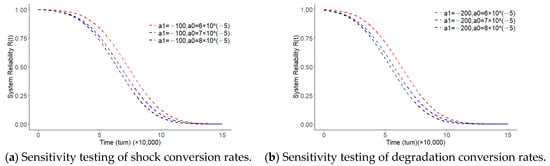 In order to investigate the effect of random shocks on the amount of degradation as well as the amount of degradation on the hard failure threshold, sensitivity analyses were performed for parameter and parameter , respectively. Parameter measures the effect of random shocks on the amount of degradation and parameter measures the effect of cumulative degradation on the hard failure threshold. As shown in Figure 4, an increase in parameter led to a decrease in the reliability of the system. The larger the parameter , the lower the reliability of the system; this is because an increase in led to a faster decrease in the hard failure threshold, and random shocks of the same intensity were more likely to lead to a hard failure of the system. Similarly, when parameter increased, the reliability of the system decreased; this is because of the increase in , which led to a greater impact of random shocks on the cumulative amount of degradation of the system. The same intensity of random shocks let the system add more degradation.