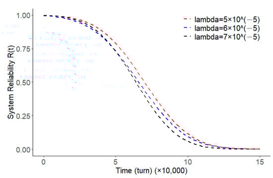 The arrival rate of random shocks is also an important factor in the reliability of a system. If the random shocks experienced by the system are too frequent, the degradation of the system increases faster, and it is more likely the system will fail at a later stage. Figure 5 shows the reliability function of a system under different random shock arrival rates. From these three reliability curves, it can be observed that the larger the random shock rate is, the lower the reliability of the system is, and the system is more likely to fail.