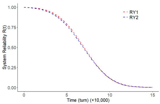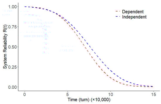 The reliability function under the interdependence of two degradation paths was obtained using the Copula function and compared with the reliability function under the independence of two degradation paths. In practical engineering applications, the interdependence between the degradation paths should be considered, such as corrosion and wear, where parts being corroded may make the wear more severe, and more wear may lead to faster corrosion. The reliability curves of the two degradation paths are plotted in Figure 6, and the reliability functions for both the independent and correlated cases of the two degradation paths are plotted in Figure 7, from which it can be seen that the reliability of the system when the two degradation paths were correlated is lower than the reliability of the system when the two degradation paths were independent, and therefore it is very important to take into account the correlation of the degradation paths. Ignoring the correlation between the two degradation paths will lead to an overestimation of the reliability of the system, thus misjudging the optimal time to maintain the system and exceeding the safe period of use of the system.