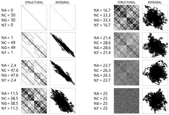 A visualization of a randomly generated sequence of 500,000 letters with different nucleotide ratios is shown. The left column shows a structural visualization at N = 16, while the right column shows an integral visualization at N = 10,000.