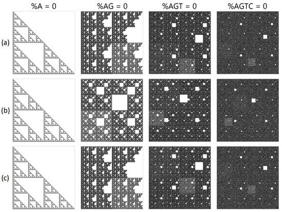 A structural visualization at N = 16 of a randomly generated sequence with the removal of particular sub-strings of nucleotides. The first column depicts all “A” nucleotides removed; the second column shows sub-strings “AG” removed; the third column demonstrates sub strings “AGT” removed; and the fourth column has “AGTC” sub-strings removed. The projections shown are (a) XY, (b) YZ and, (c) XZ, where X denotes purines/pyrimidines; Y represents amino/keto; and Z represents the number of hydrogen bonds.