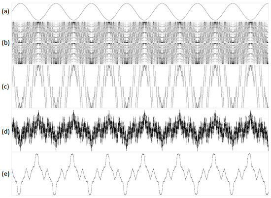 The visualization of the sound of a bell in various one-dimensional projections: (a) original acoustic signal; (b) structural representation of purine/pyrimidine; (c) structural representation of amino/keto; (d) integral representation of purine/pyrimidine; and (e) integral representation of amino/keto. The x-axis of the geometric representations denotes the ordinal number of the N-plet, while the y-axis denotes the value of the N-plet.