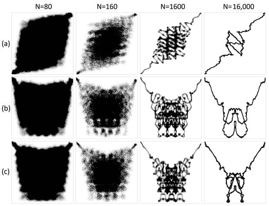 During numerical experiments, pseudo-random symbolic genetic sequences were generated. Mappings were constructed with different scaling parameters (N). Figure 1 displays the results of randomly generated genetic sequences of length 500,000 with different ratios of nucleotides. Figure 2 shows the mappings for a randomly generated sequence with deletions of sub-strings “A”, “AG”, “AGT”, and “AGTC”. Examples of the operation of the pseudo-random sequence generator during the synthesis of a 500,000-character nucleotide sequence are presented in Figure 3.