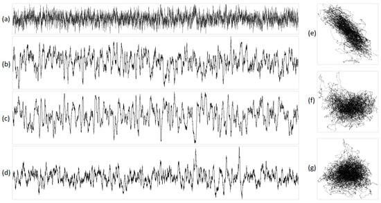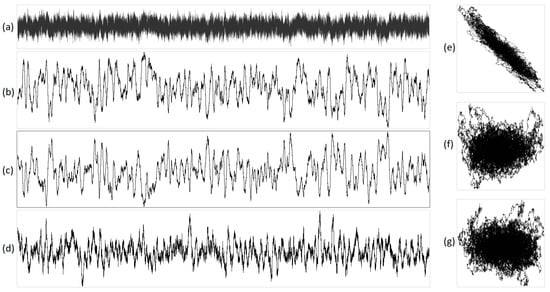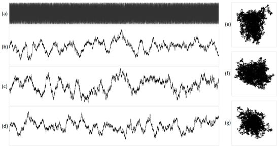 The integral representation of white noise at N = 16,000. The original acoustic signal is shown in (a), and its projections are illustrated in (b) X, (c) Y, (d) Z, (e) XY, (f) YZ, and (g) XZ. X represents purines/pyrimidines, Y represents amino/keto, and Z represents two/three hydrogen bonds.