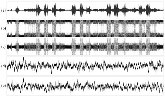 The visualization of the sound of birds singing in various one-dimensional projections: (a) original acoustic signal; (b) structural representation of purines/pyrimidines; (c) amino/keto structural representation; (d) integral representation of purines/pyrimidines; and (e) amino/keto integral representation. Geometric representations along the abscissa axis are marked with the sequence number of the N-plet, while N-plet values are marked on the ordinate.