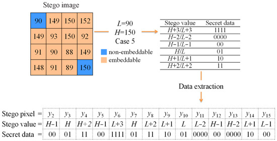 - For each pixel of embeddable pixels {y2, y3, …, y15}, we extract the secret data according to the absolute difference of H and L and the lookup table defined below: