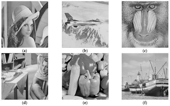 Greyscale test image. (a) Lena; (b) F-16; (c) Baboon; (d) Barbara; (e) Peppers; and (f) Boat.